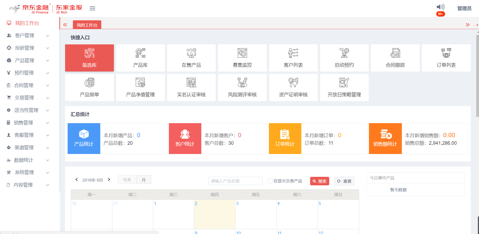 - 我的(de)工(gōng)作台:提供系統菜單快捷入口,統計(jì)核心業(yè)務數據及開(kāi)放(fàng)期内的(de)産品日曆事件(jiàn)展示