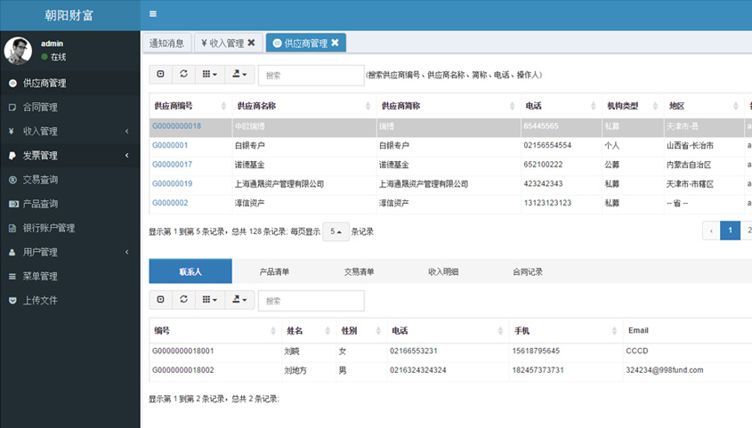 - 供應商管理(lǐ): 供應商信息管理(lǐ),包括交易、收入、聯系人(rén)、産品等